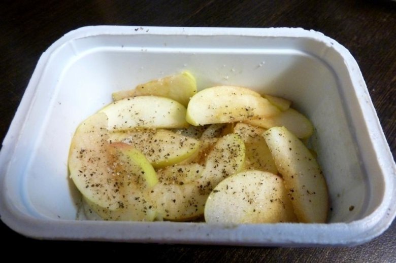 Третий слой — яблоки. Поперчить и посыпать щепоткой сахара.