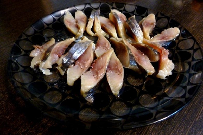 Соленую селедку почистить, разделать на филе и нарезать кусочками.