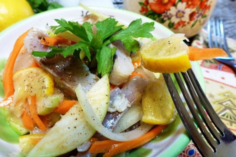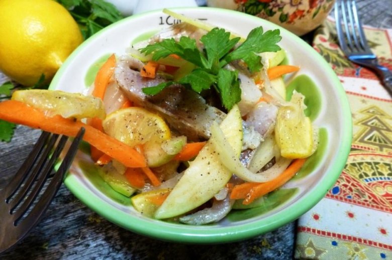 Утром вкусный салат готов! Подавать с картофелем и черным хлебом на обед или как закуску на праздничный стол.