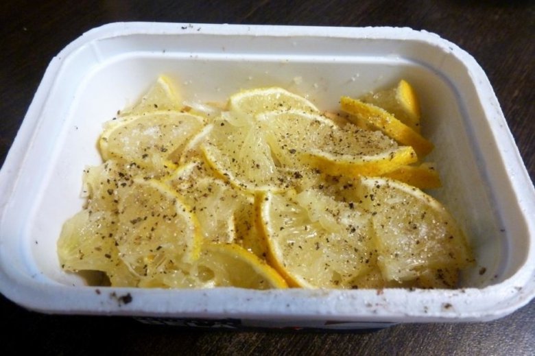 Четвертый слой — лимон. Поперчить и посыпать щепоткой сахара.