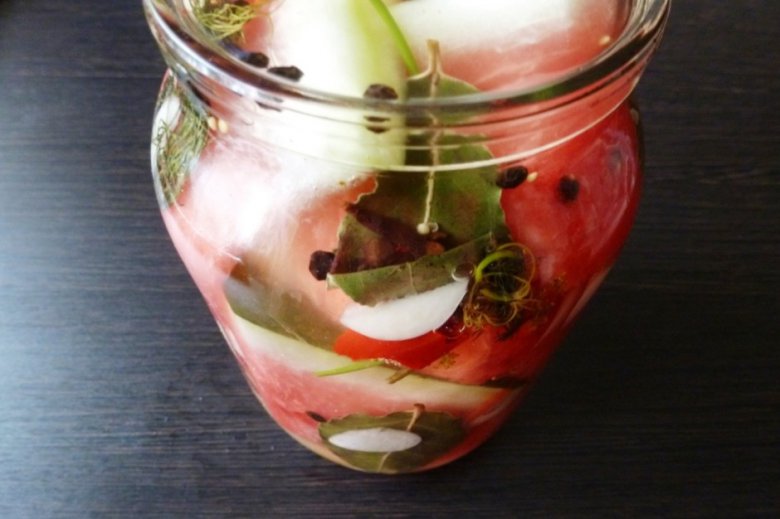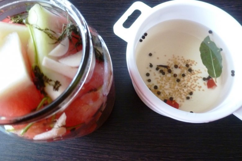 Залить банку с арбузом теплым рассолом. Оставить при комнатной температуре на ночь – должен начаться процесс брожения. На следующий день поставить в холодильник. Через 3-4 часа можно попробовать.