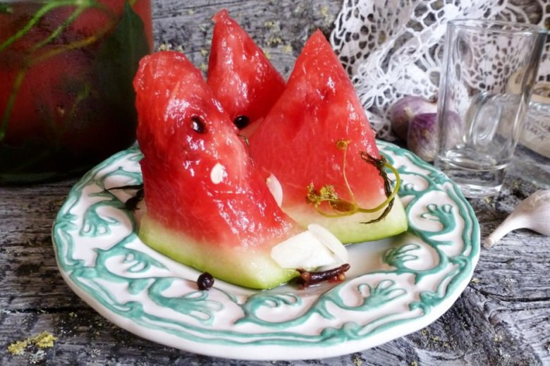Август – октябрь сезон арбузов. А ведь из них можно приготовить столько замечательных блюд! В том числе и на закуску! Делюсь рецептом остро-пряных квашеных арбузов. Не на зиму (там другая технология), а просто похрустеть. Арбуз нарезать на треугольники, шкурку можно срезать, а можно и нет. Чеснок почистить и нарезать пластинками. Пару зонтиков укропа промыть.
