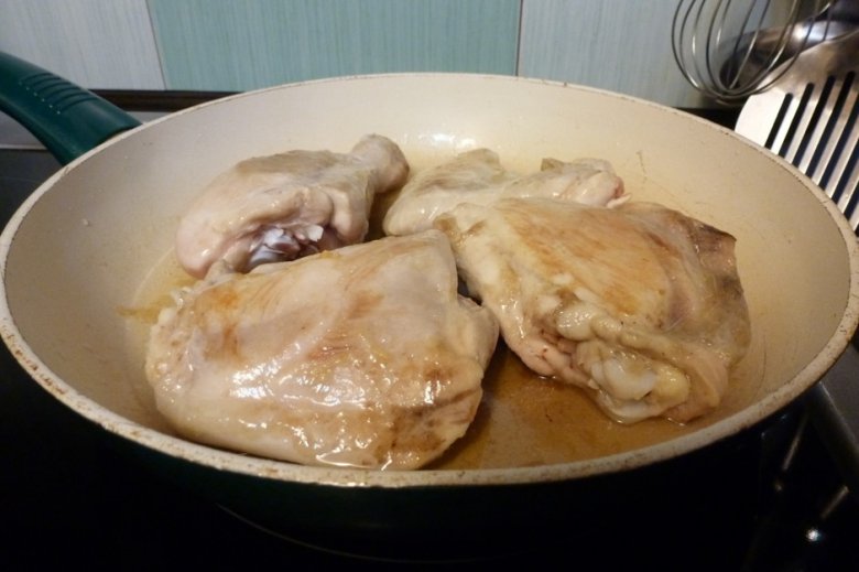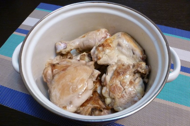 Сложить в кастрюлю обжаренные кусочки курицы.