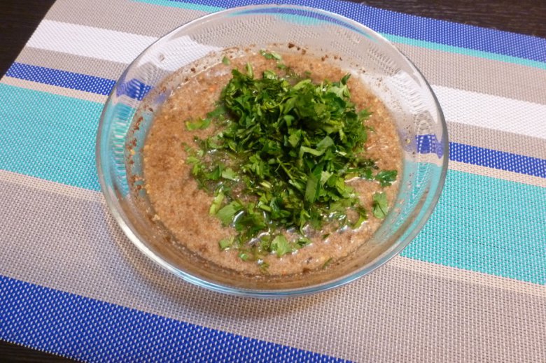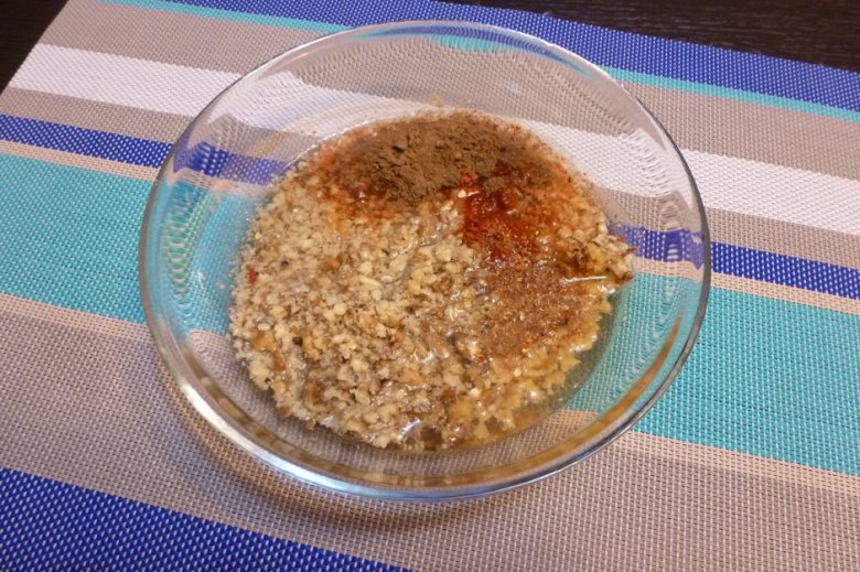 Пока обжаривается курица, приготовить маринад. Специи и орехи измельчить, зелень мелко нарубить, имбирь натереть на мелкой терке. Все смешать с винным уксусом, солью. Советую развести винный уксус водой, чтобы не было кисловато.