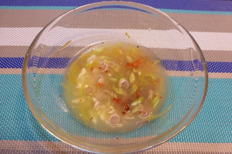 Приготовить маринад. Для этого счистить цедру с цитрусовых, выжать сок из целого лайма и половины лимона. Лемонграсс, чеснок, чили мелко порезать. Все смешать, добавить соль, сахар, перец, оливковое масло. Соль, сахар и сок цитрусов – дело вкуса. Но вот остроты положите, ведь сальса – острая закуска!