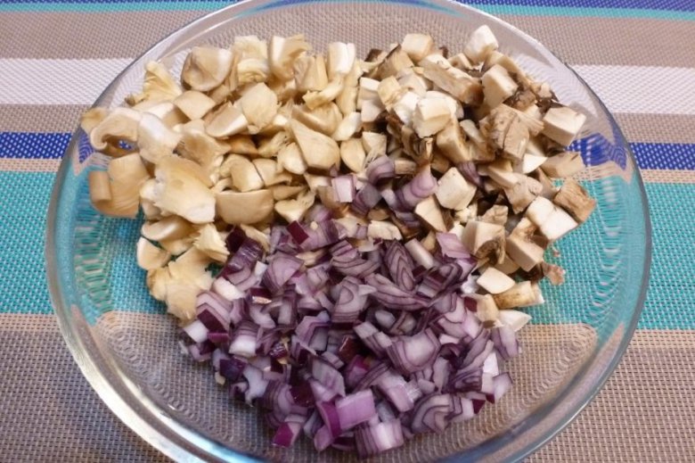 Шампиньоны и вешенки нарезать мелким кубиком. Сладкий лук измельчить.