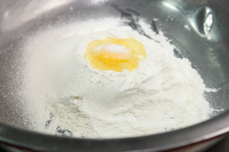 Приготовить тесто. Просеять почти всю муку, чтобы получилась горка. В центре сделать углубление и разбить в него яйцо. Добавить соль и половину растительного масла.