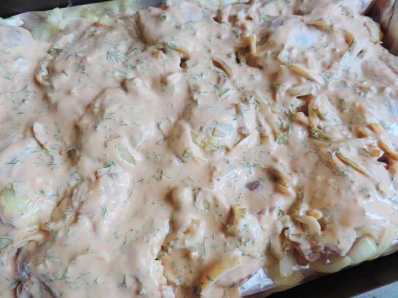Сделать соус: в миске соединить сметану, томатную пасту, мелконарезанный укроп, выдавить через пресс 2-3 зубчика чеснока, посолить по вкусу, обязательно добавлить сахар (примерно полстоловой ложки). Перемешать до однородности, полученной смесью залить окорочка.