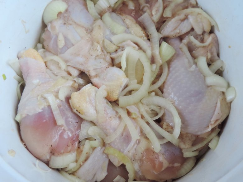 Подготовить окорочка. Разрезать их в суставе, чтобы получить голень и верхнюю часть бедрышка. Лук почистить, нарезать тонкими полукольцами. Подготовленные окорочка сложить в кастрюлю, туда же отправить нарезанный лук, соль, перец и любимые приправы. Накрыть кастрюлю крышкой и оставить окорочка мариноваться минимум на час. Чем дольше они простоят, тем лучше. Я обычно оставляю их на ночь.