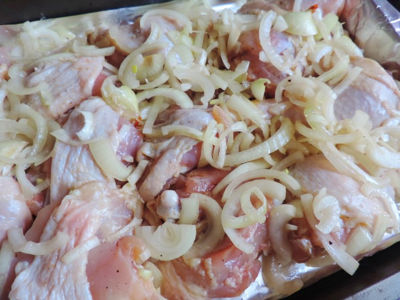 Замаринованные окорочка вместе с луком выложить на противень для запекания (я всегда застилаю противень фольгой).