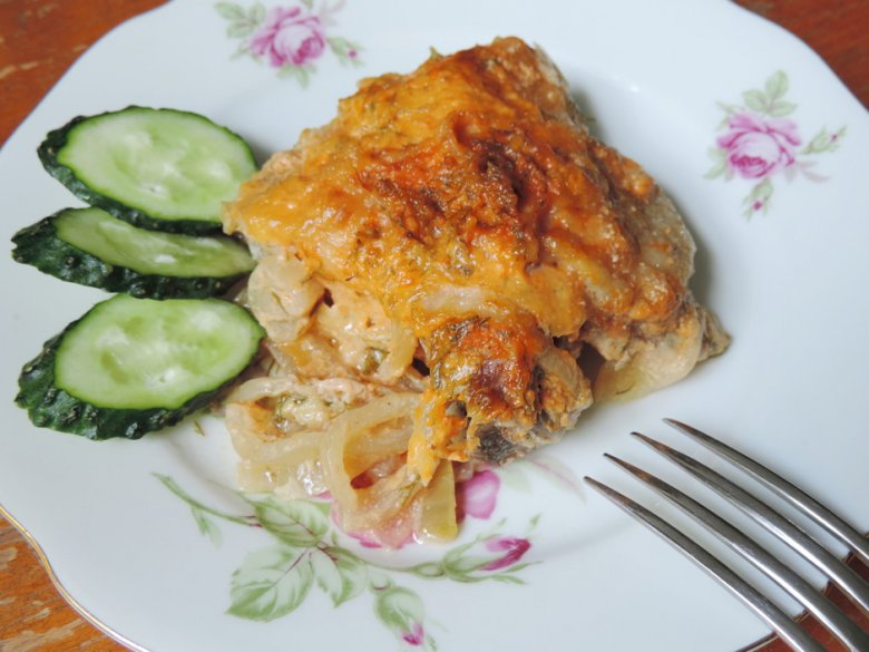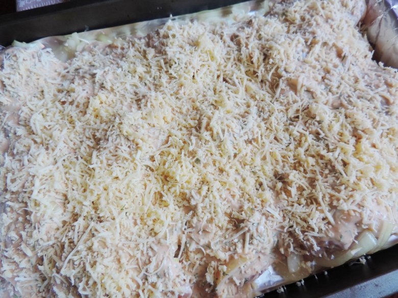 Посыпать сверху тертым сыром, отправить в разогретую до 200 градусов духовку на полчаса.