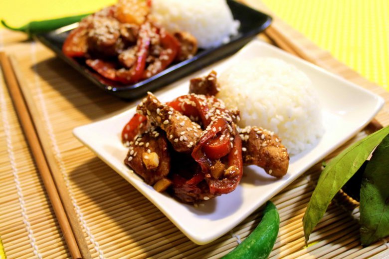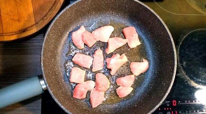 Разогреваем сковороду или вок с кунжутным маслом (можно взять любое растительное). Обжариваем свинину небольшими порциями на сильном огне.
