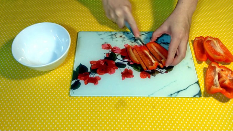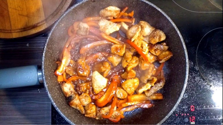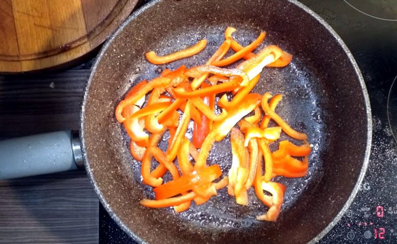 Когда мясо будет готово, убираем, уменьшаем огонь и на этом же масле обжариваем перец.