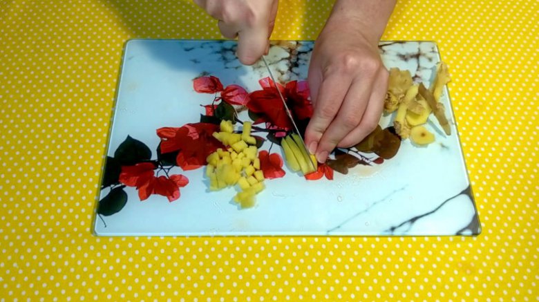 Очищаем имбирь и чеснок, нарезаем кубиками.