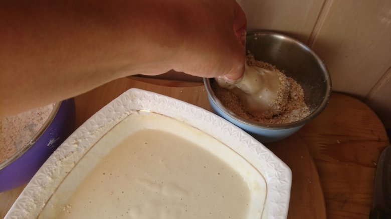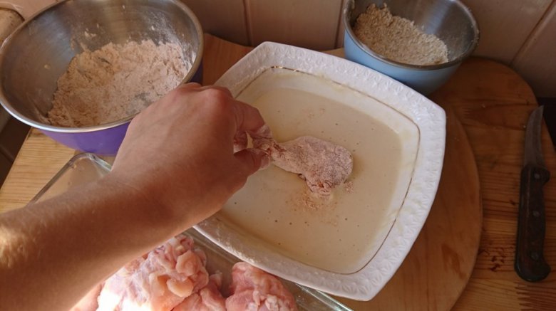 Каждый кусочек курицы обмакнуть сначала в смесь муки.