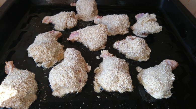 Выложить все кусочки на противень, смазанный растительным маслом. Запекать в разогретой до 180 градусов духовке 25-30 минут.