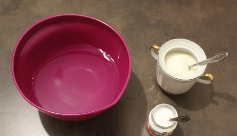 В глубокую миску налить кипяток, добавить соль и сахар, перемешать.