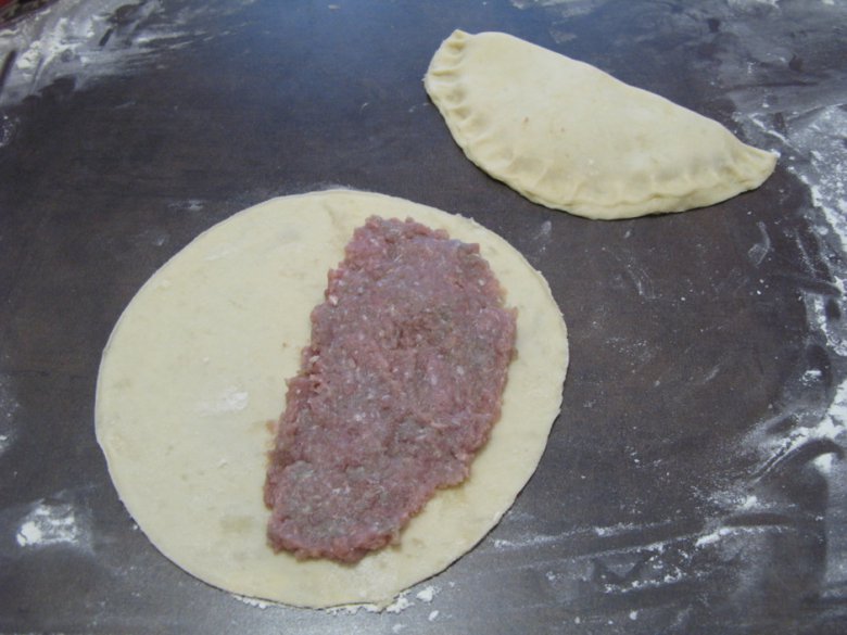 Готовое тесто раскатать. С помощью тарелки вырезать из раскатанного теста круги. На каждый круг выложить начинку и защипнуть края.