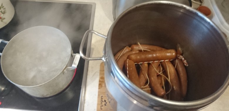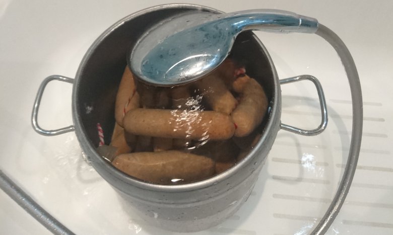 На следующее утро приступаю к варке. Так как сосиски не толстые (2 см в диаметре) их удобно варить методом "2 кипятка". Заливаем их кипятком на 15 минут, затем воду надо слить, и снова залить кипятком на 15 минут. Готово.