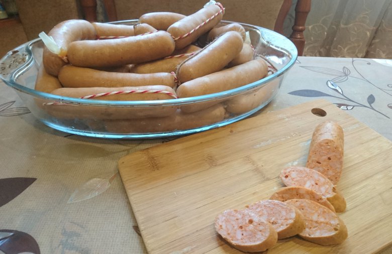 Охлажденные сосиски убрал в холод на отдых, на ночь. Утром на завтрак уже можно и нужно их есть. Получилось очень достойно,пряный, яркий вкус специй - перцев, перечная острота умеренная, легкая нота копчености. Текстура плотная сочная. Единственно стоит заменить воду на бульон, или уменьшить количество воды - чувствуется "водяная" нота.