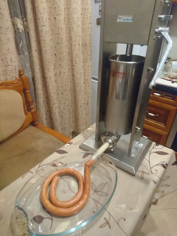 Готовый фарш загрузил в колбасный шприц и набил в оболочку. У кого нет подобного агрегата, можно набить с помощью специальной насадки на мясорубку.