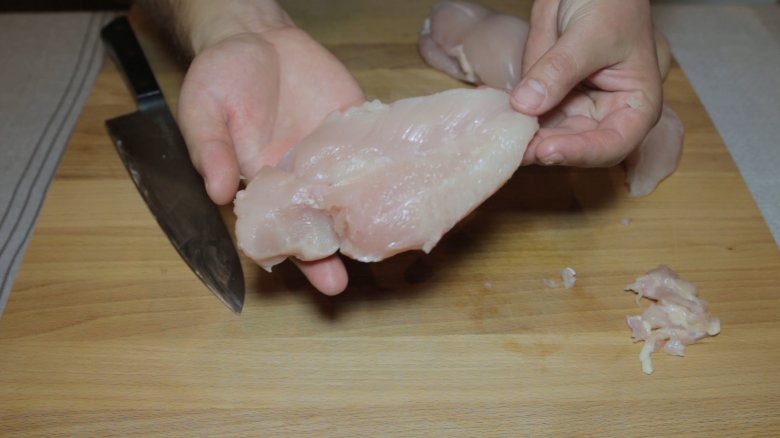 Берем филе куриной грудки очищаем его от лишних пленочек, косточек и жировых прослоек. Как следует его моем и просушиваем бумажным полотенцем.