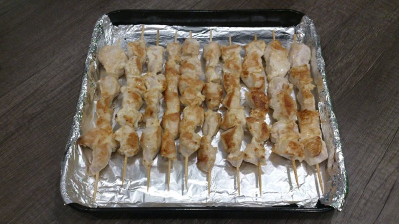 Шашлычки обжарить на сковородке до образования румяной корочки со всех сторон. Обжаренное мясо на шпажках выложить на подготовленный противень.