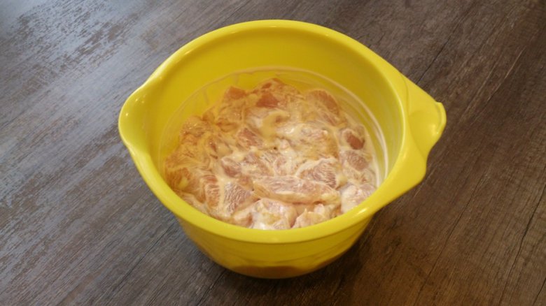 Кусочки куриного мяса посолить и перемешать. Добавить майонез, снова тщательно перемешать и поставить мариноваться в холодильник на 4 часа.