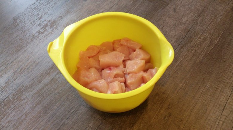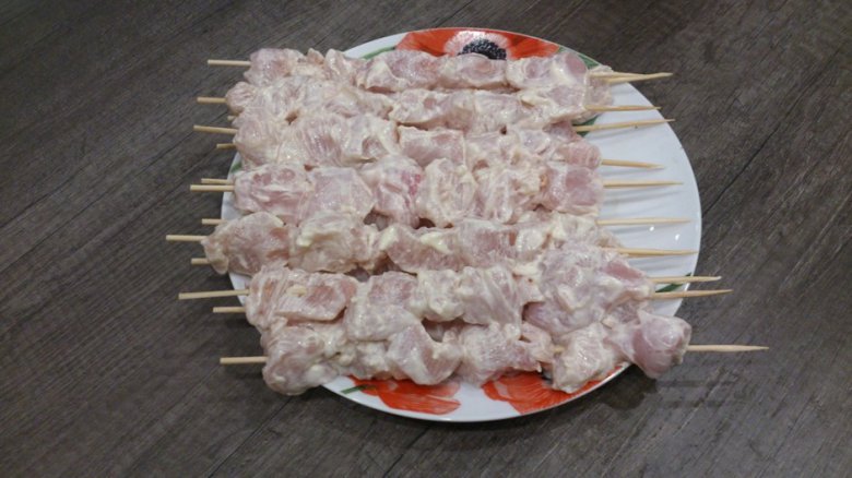 Взять шпажки и нанизывать на них кусочки куриного филе. На каждую шпажку насаживать 5-6 кусочков.