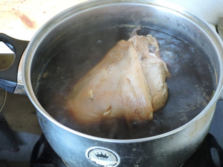 В первую очередь я помыла рульку, поскоблила шкурку. Взяла подходящую кастрюльку, Нашпиговала рульку чесноком, засыпала специями и залила пивом. Так как я готовила вечером, рульку я убрала в холодильник на ночь мариноваться.
