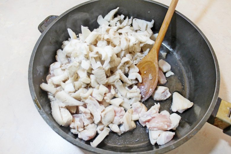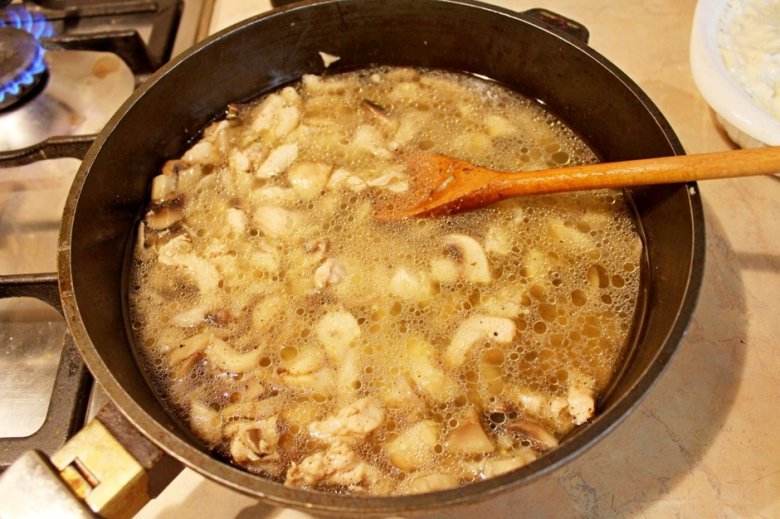 К курице с грибами добавить 2-2,5 стакана воды.
