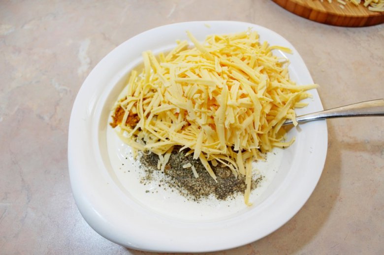 Для соуса смешать сливки, тертый сыр, соль, перец, орегано и карри.
