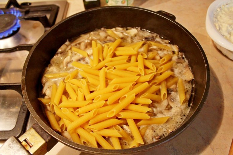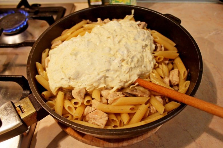 Рецепт приготовления пасты с курицей и грибами в сырным соусом.