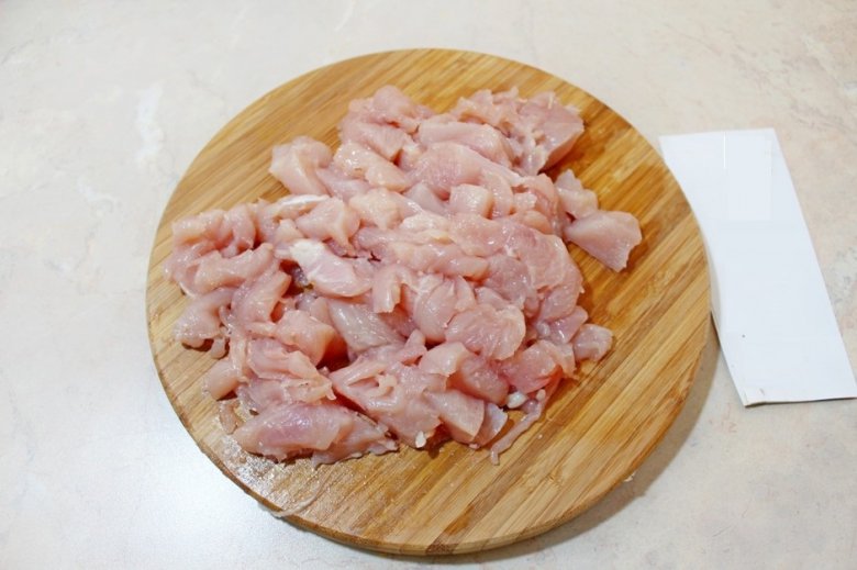 Куриное филе нарезать на мелкие кусочки. Выложить в сковороду с растительным маслом и обжаривать 5 минут.