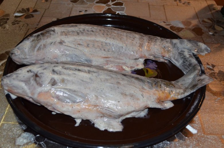 Натереть рыбу солью и перцем. Смазать майонезом со всех сторон и внутри.