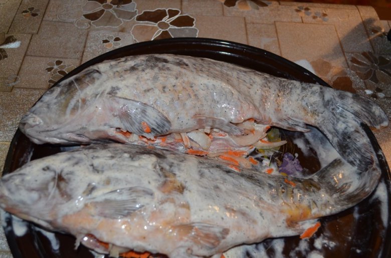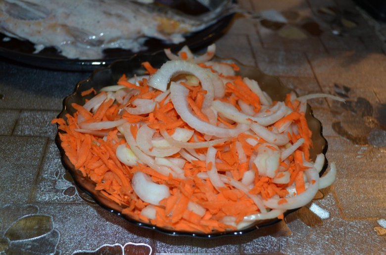 Нафаршировать рыбу морковью и луком.Выложить на лист и отправить в духовку на 1 час при 180 градусах.