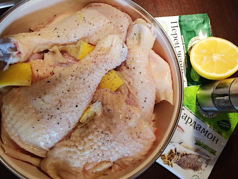 Курицу замариновать в лимонном соке, добавив соль, перец, кардамон (коробочки нужно разрезать, внутри — семена). Мариновать минимум два часа (если остаётся на завтра, нужно добавить масло, чтобы не стало сухим).