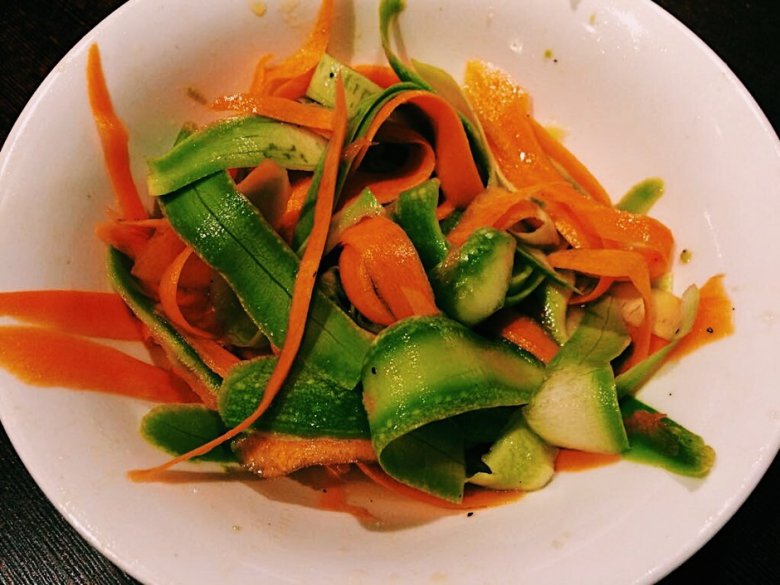 Кабачок и морковь нарезать овощерезкой лентами, замариновать в соке апельсина и лимона с солью и перцем в течение 20 минут, добавить молотый кориандр.