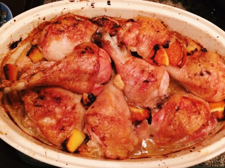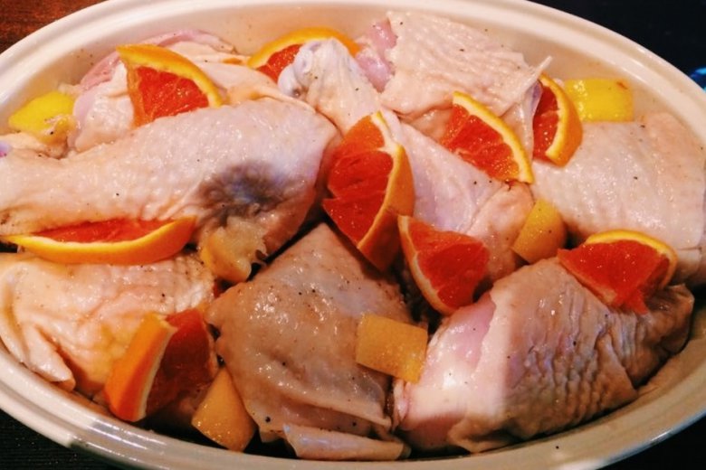 За 30 минут до запекания достать курицу из холодильника. Добавить кусочки апельсина.