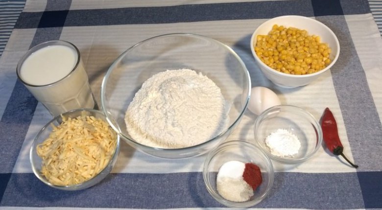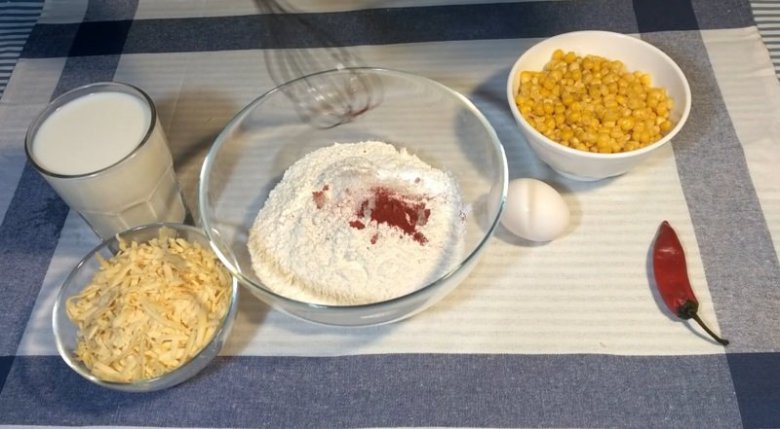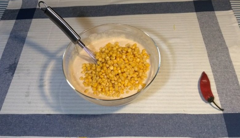 Всыпаем сыр, кукурузу. Перемешаем до однородности. Добавляем мелко порезанный чили. Тесто готово