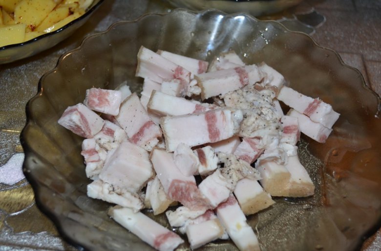 Сало порезать кусочками. Сало можно использовать как соленое, так и несоленое (тогда нужно посолить).