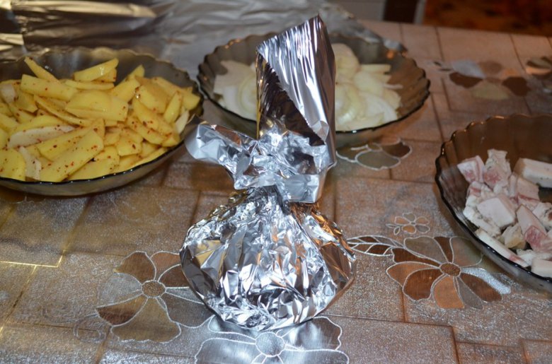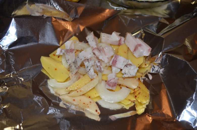 От рулона фольги оторвать кусочек около 30 см. В середину выложить горсть картошки, лук и сало.