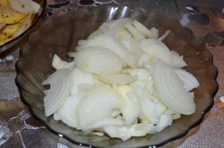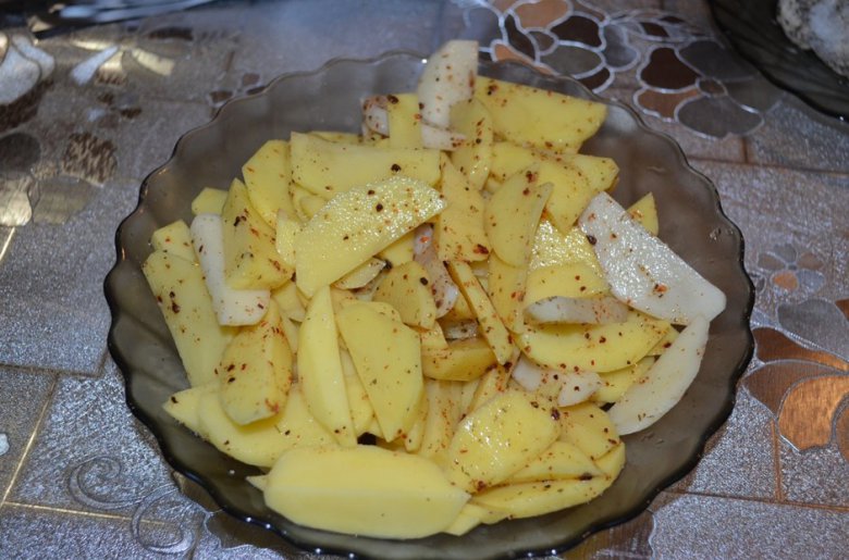 Картофель порезать, посолить, добавить приправы для картофеля.