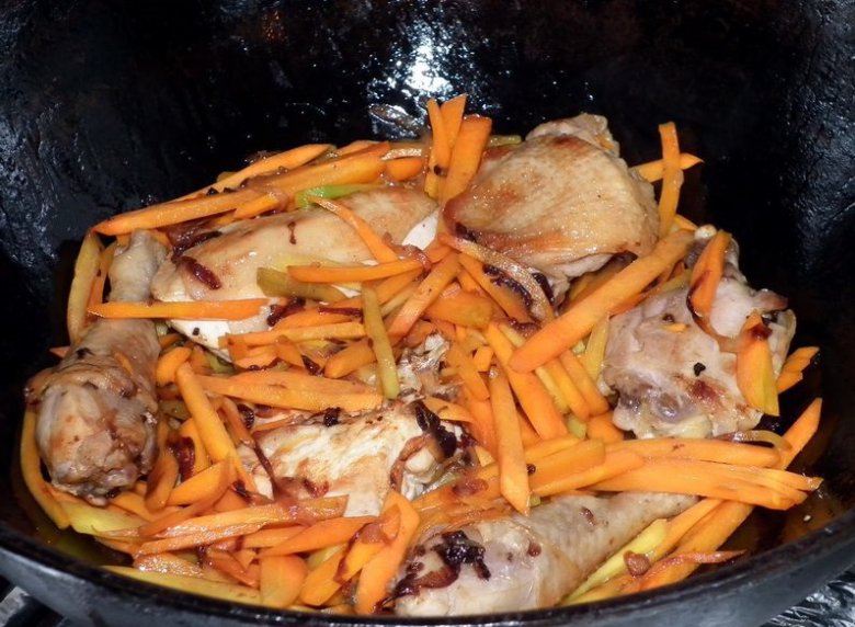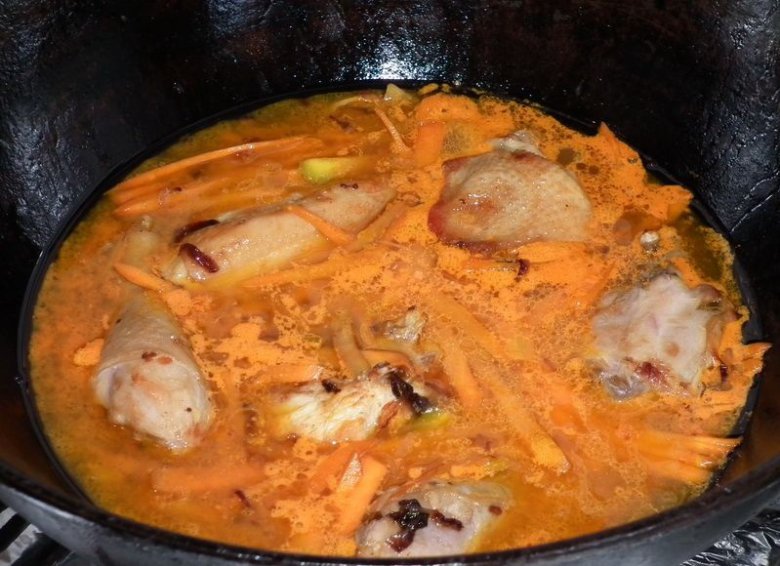Залить отжатым соком на уровне содержимого казана, тушить на медленном огне. Время тушения колеблется от 40 минут до 1,5 часа в зависимости от сорта и возраста курицы или петуха. В конце добавить зиры и посолить. Т.к. морковный сок выделяет свои соли, то солить следует внимательно, иначе возможно пересолить блюдо.