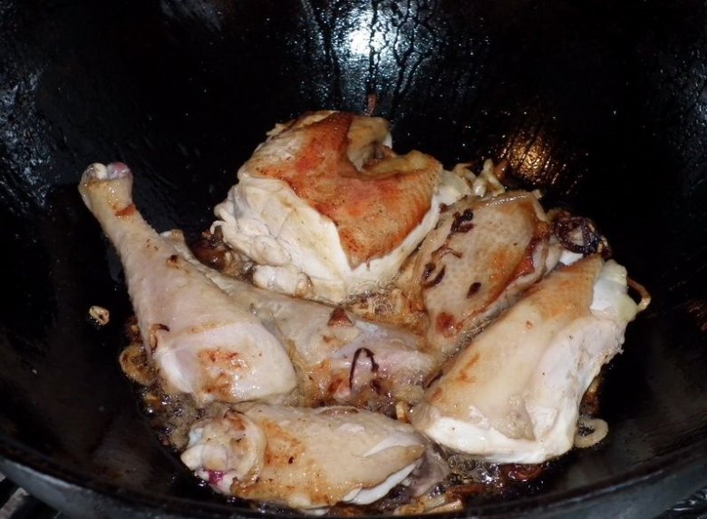 Перекалить растительное масло, обжарить в нем слегка кольца лука. Затем обжарить курятину, порезанную на порционные куски, пару раз перевернув.