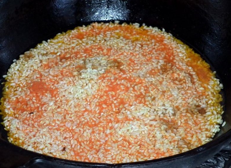 По готовности зирвака, заложить ровным слоем замоченный рис. Увеличить пламя и залить оставшийся морковный сок. Т.к. морковный сок впитывается рисом и ведет себя иначе, чем вода, то заливать его следует с осторожностью - лучше долить потом, чем получить разварившийся рис.