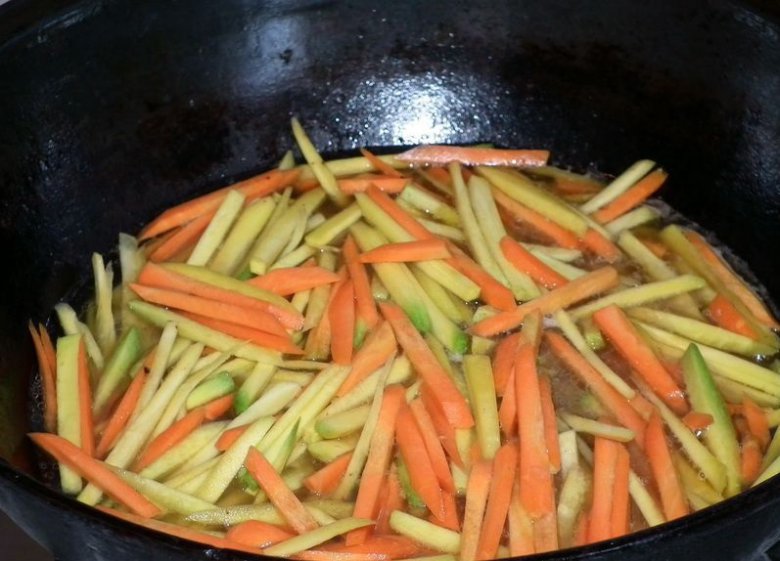 Следом на мясо уложим нашинкованную крупной соломкой морковь, и не мешая зальем водой, на пару миллиметров ниже уровня моркови, т.к. морковь осядет в процессе варки.
