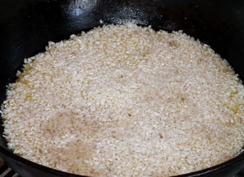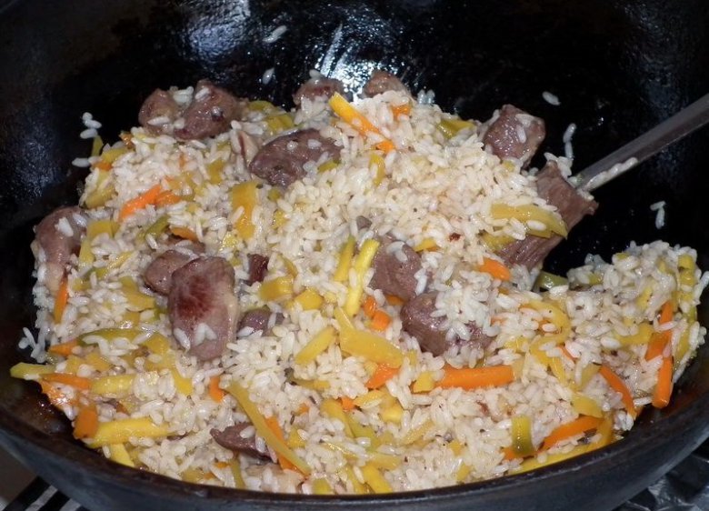 Как только в казане практически не останется воды, перемешаем все содержимое казана. С огнем тут следует быть внимательным, регулируя его, иначе есть вероятность пригорания риса. Если рис начать перемешивать при наличии воды в казане, дальнейшее выпаривание влаги будет намного сложнее и в результате есть вероятность получить не рассыпчатый плов (а может быть в Кашкадарье именно такой плов?)