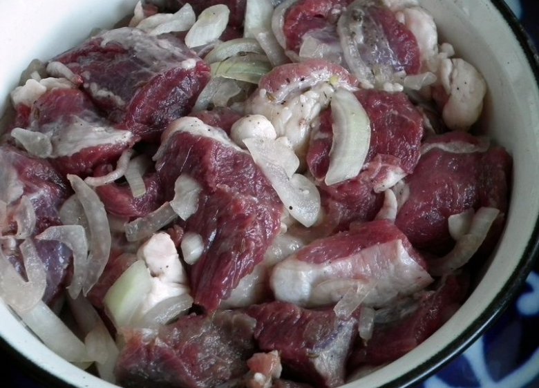 Еще одной отличительной особенностью этого плова является маринование мяса, что хорошо сказывается при использовании говядины. Мясо порежем на кусочки как для шашлыка, лук (грамм 200) тонко нашинкуем или порубим, смешаем его с солью, черным молотым перцем и зирой, смешаем с мясом и оставим мариноваться на пару часов, придавив тарелкой.