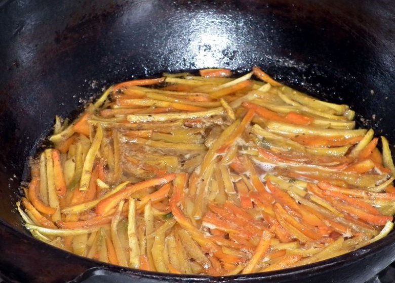 Ну что ж, попробуем... Для этого возьмем: 1 кг риса, 1 кг мяса, 1 кг моркови, грамм 300 растительного масла, 300 гр лука, соль и специи - по вкусу.